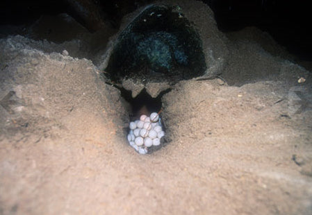 When night falls, female turtles come ashore to lay their eggs. It is a slow process as the turtles dig the sand with their flippers, lay and bury their eggs for incubation before making their way back into the sea.
